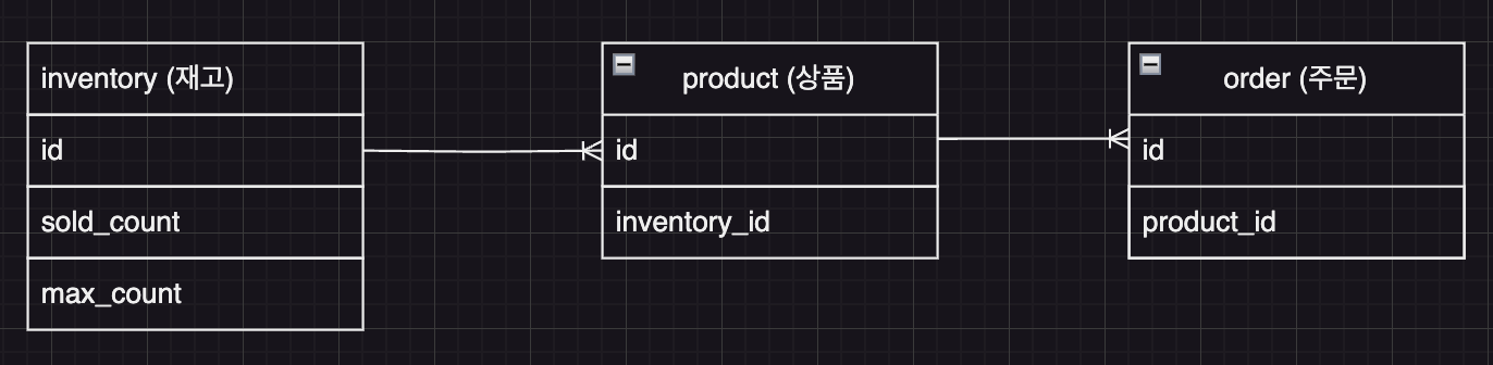 ๊ธฐ์กด์ ๋ฐ๋๋ฝ ๋ฌธ์ ๋ฅผ ์๋ฐฉํ๊ธฐ ์ํด ์๋ก์ด ํ ์ด๋ธ inventory๋ฅผ ๋ง๋ค๊ณ ๊ธฐ์กด์ product ํ ์ด๋ธ์ ์๋ sold_count(ํ๋งค์๋), max_count(์ฌ๊ณ ) ์ปฌ๋ผ์ inventory ํ ์ด๋ธ๋ก ์ฎ๊ฒผ์ต๋๋ค.